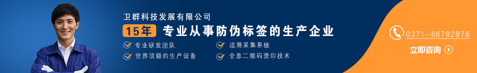 ???????? 河南省衛(wèi)群科技發(fā)展有限公司 成立于2002年,位于鄭州經(jīng)濟(jì)技術(shù)開(kāi)發(fā)區(qū),是一家專業(yè)從事數(shù)碼防偽溯源標(biāo)簽、溯源查詢系統(tǒng)、激光全息防偽標(biāo)簽、刮刮標(biāo)簽、個(gè)性化防偽標(biāo)簽的生產(chǎn)企業(yè),是河南省高新技術(shù)企業(yè),是河南省產(chǎn)品追溯防偽工程技術(shù)研究中心、鄭州市激光全息防偽工程中心、鄭州市企業(yè)技術(shù)中心,是ISO9000認(rèn)證企業(yè),是 《食鹽標(biāo)碼合一標(biāo)志技術(shù)條件》 和 《食鹽標(biāo)碼合一...